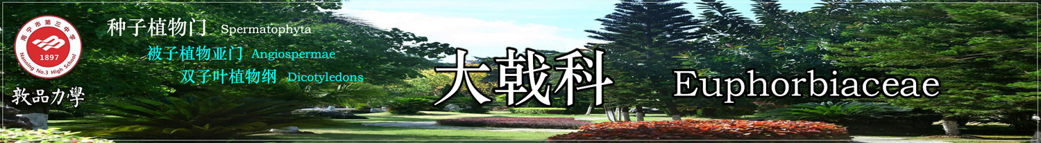 大戟科物种丰富,分布广泛,大多有一定毒性。本科有许多的经济作物,如产橡胶的橡胶树;油料作物蓖麻、油桐、乌桕;产淀粉的木薯;产水果的余甘子,当然,还有很多观赏植物,在校园里走走,一定会看到不少。