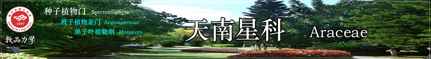 南星科植物具块茎或伸长的根茎,常有乳状液汁,叶通常基生,花序为一肉穗花序,我国有206种。本科种类50%以上为药用植物,如半夏、虎掌、千年健等,是历史悠久的常用中药。天南星科花卉对水培条件有着极大的适应性,大量的观叶品种出现在园林绿化中,如广东万年青、绿萝、春羽、龟背竹、银苞芋、绿巨人、合果芋、海芋、火鹤花、马蹄莲等。该科中芋和魔芋的球茎成为餐桌上的珍品。
